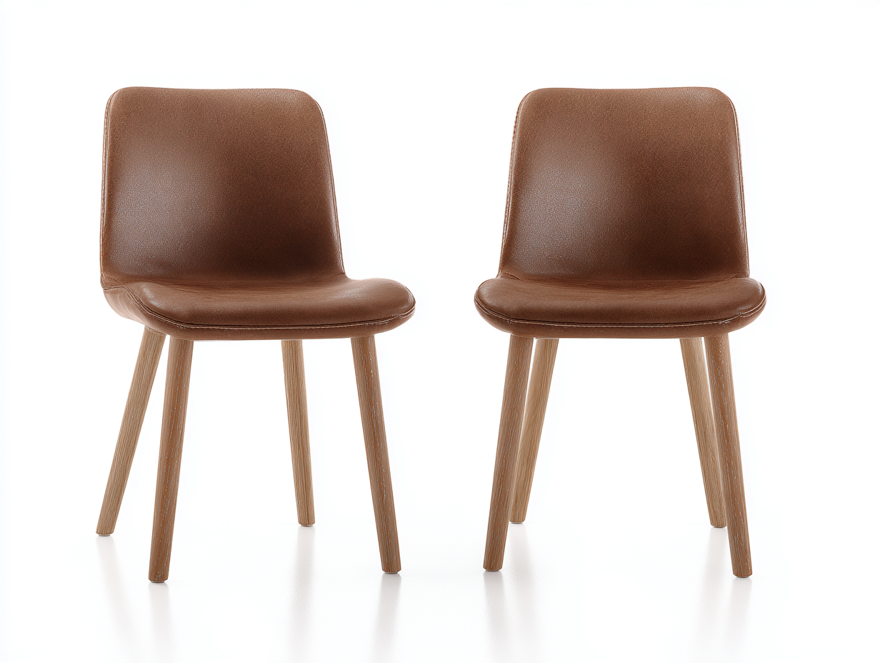The seat is upholstered in brown faux leather with a smooth, even surface that is easy to maintain. The legs are made of solid wood with a natural finish, providing stable support and a warm contrast to the upholstered seat.
