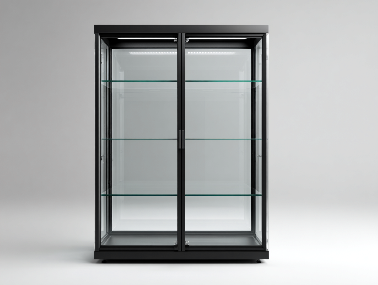 The enclosed glass design helps protect displayed items from dust while maintaining full visibility. The vertical form makes efficient use of floor space and integrates well into modern interior environments.
