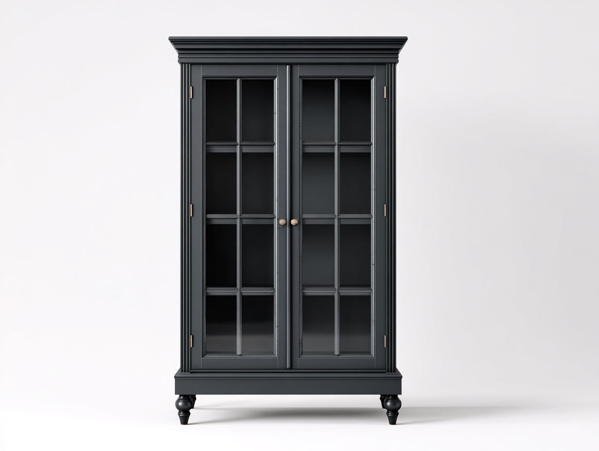 This display cabinet features a tall, refined silhouette designed for showcasing decorative items, books, or tableware. Its enclosed glass-door structure allows items to be clearly displayed while maintaining an organised appearance, suitable for living rooms, dining areas, or home offices.