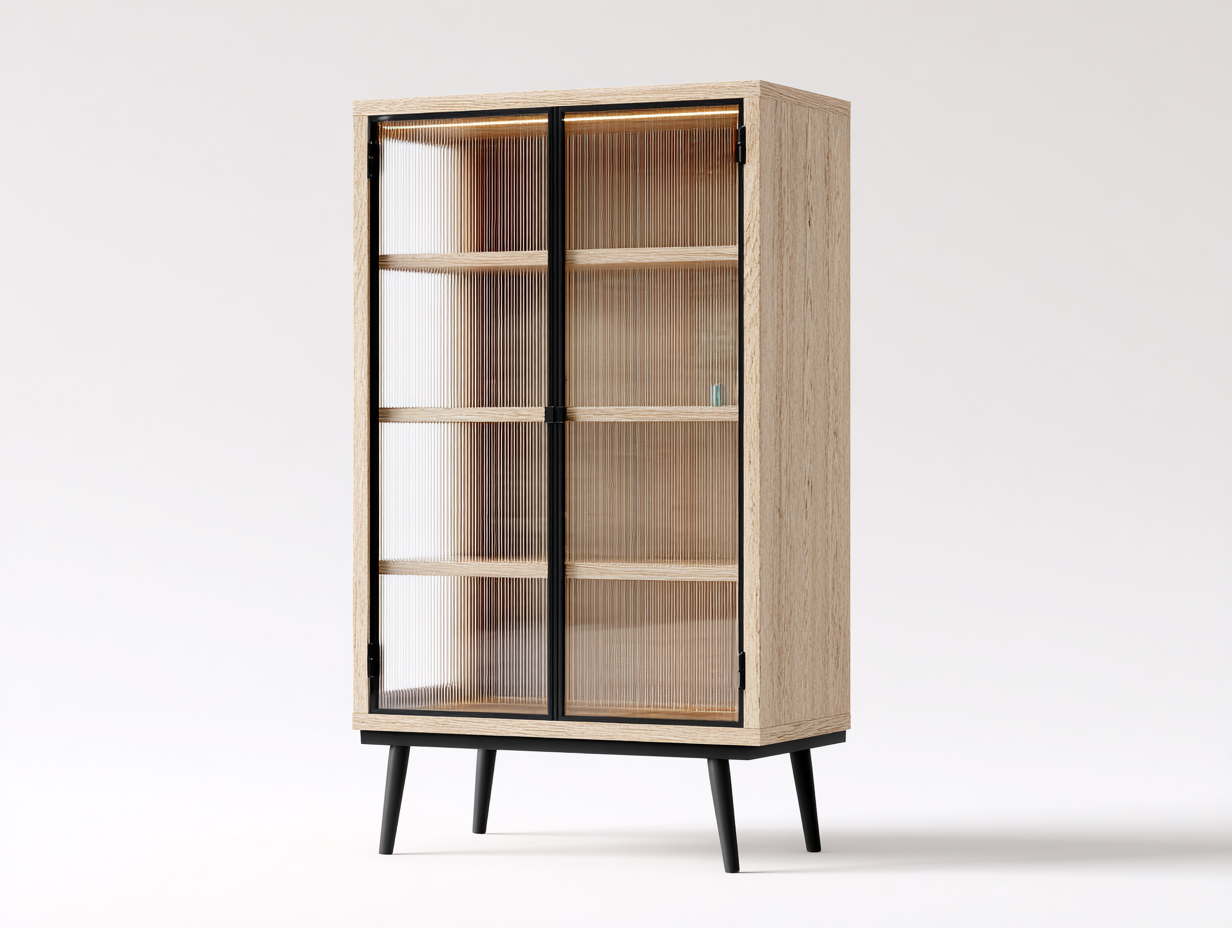 The cabinet is crafted from engineered wood with a natural wood finish, paired with vertically textured glass doors. The structure is supported by sturdy black legs, providing stable support and a light visual appearance.