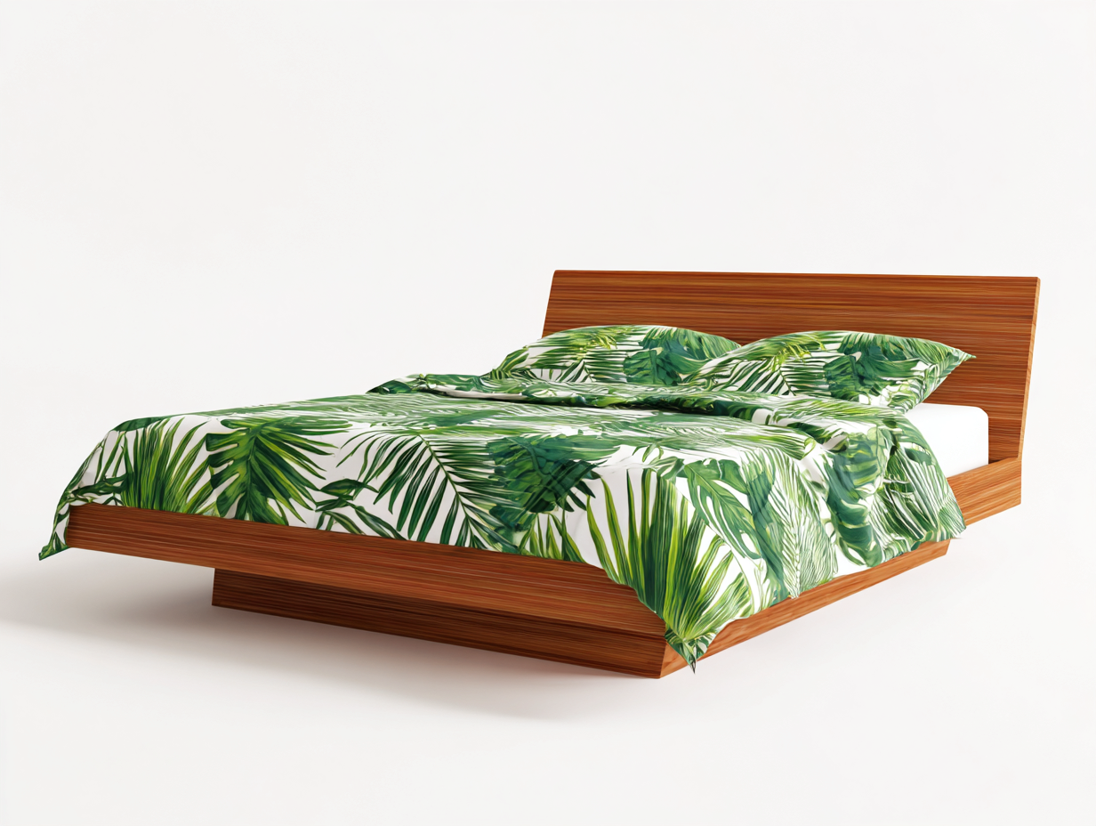 This double bed features a low-profile platform design with clean lines, offering a modern and balanced look for contemporary bedrooms. Its streamlined structure provides stable mattress support while maintaining a light visual footprint.
